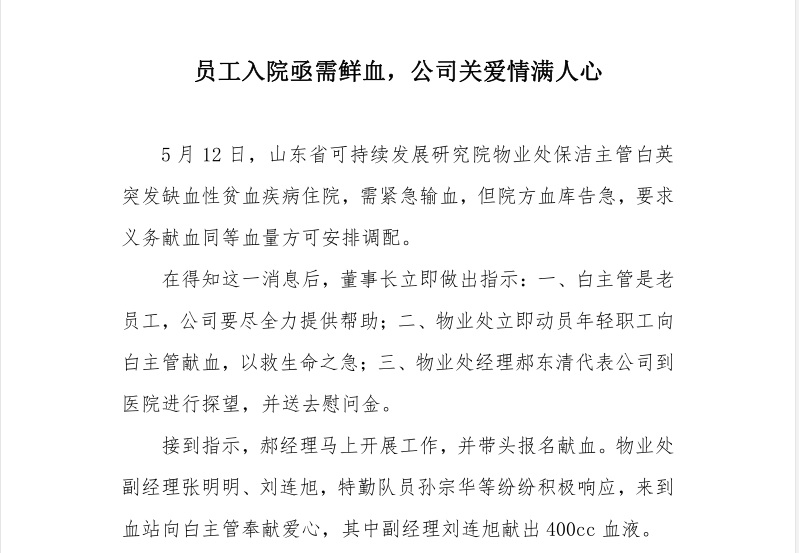 員工入院亟需鮮血,公司關(guān)愛情滿人心