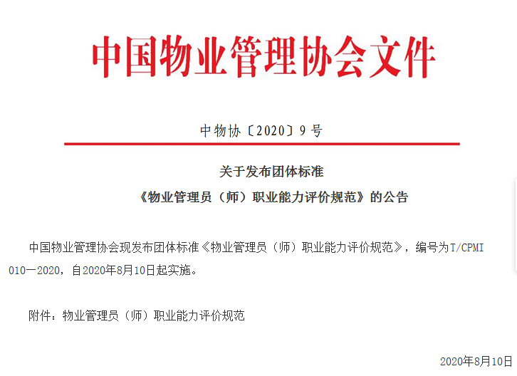 關(guān)于發(fā)布團(tuán)體標(biāo)準(zhǔn) 《物業(yè)管理員(師)職業(yè)能力評(píng)價(jià)規(guī)范》的公告
